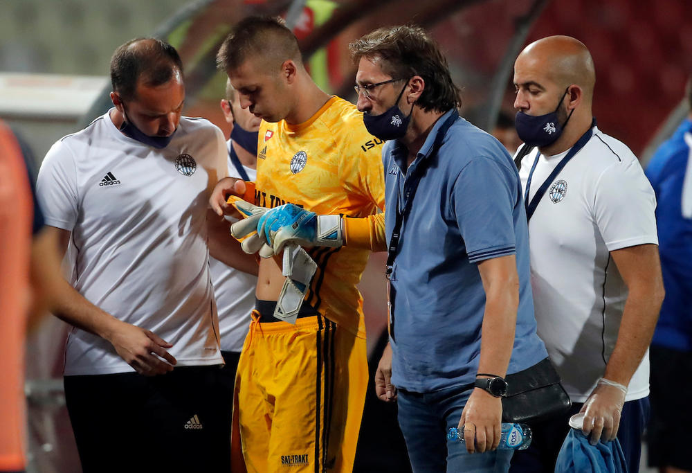 Golman ekipe iz Bačke Topole je prevezen u Urgentni centar u Beogradu nakon neopreznog i žestokog starta napadača Crvene zvezde koji mu je kopačkom ušao u stomak sredinom prvog poluvremena.