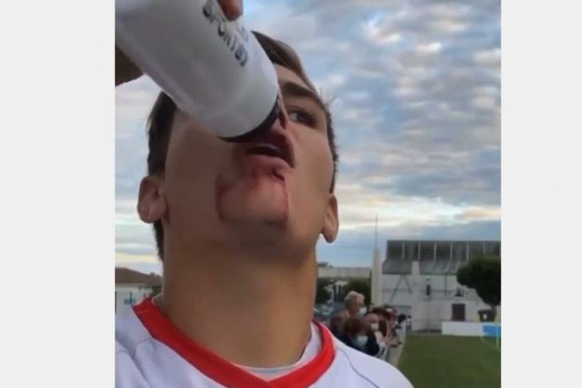 Fudbaler pije vodu, a ona ispada kroz rupu u vilici, Foto: Printscreen