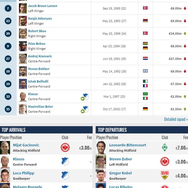 Prošla sezone je bila prilično uspešna za Hofenhajm, koji je sezone završio sa šestom mestu sa 52 osvojena boda. Glavna perjanica Hensove ekipe je neverovatni hrvatski reprezentativac Andrej Kramarić, koji godinama unazad prikazuje blistave partije u Bundsligi. Ove sezone je već uspeo da skupi pet golova na svom kontu.
