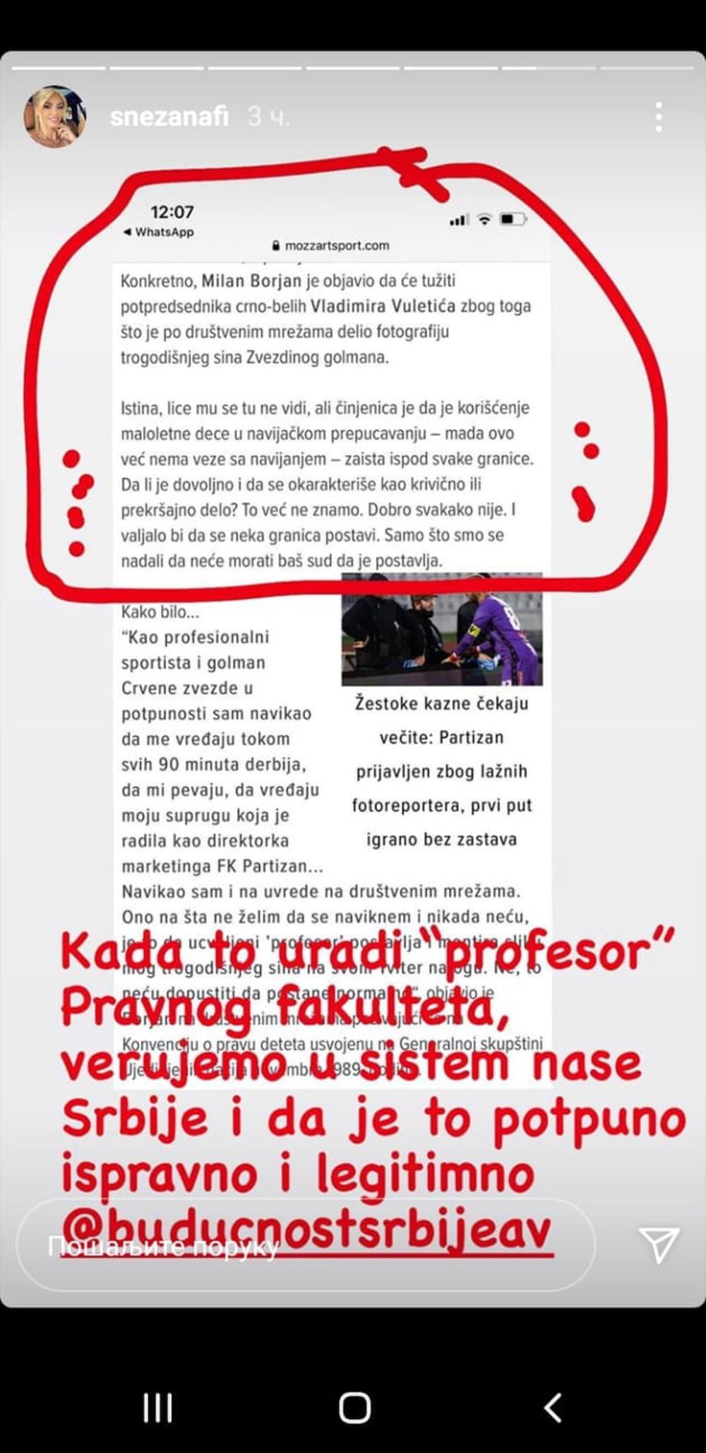 Cela zvezdaška javnost se digla protiv Vuletića, a jedan od najglasnijih da se potpredsednik crno-belih sankcioniše je Snežana Borjan, supruga golmana Crvene zvezde.