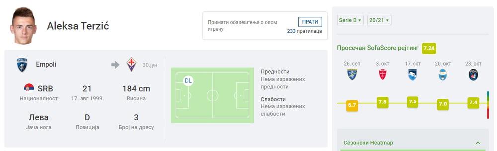 Pogotovo što je uvedeno pravilo o bonusima pa bi tako Aleksa Terzić bio idealno rešenje za poziciju levog beka. Mladi reprezentativac Srbije je prošle godine u transferu vrednom 1.700.000 evra pojačao redove Fiorentine, gde se prošle sezone nije mnogo naigrao, te ga je VIola poslala na pozajmicu u Empoli.