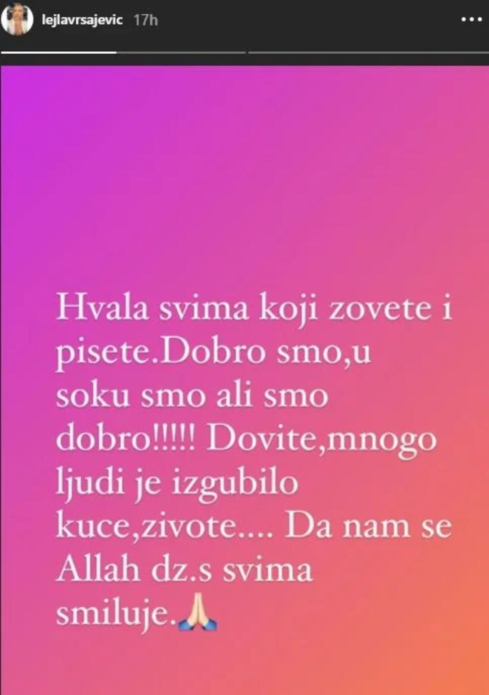 - Hvala svima koji zovete i pišete. Dobro smo u šoku smo, ali smo dobro. Mnogo ljudi je izgubilo kuće, živote... Da nam se Alah svima smiluje - poručila je Lejla putem Instagrama uz potresnu fotografiju svog deteta.