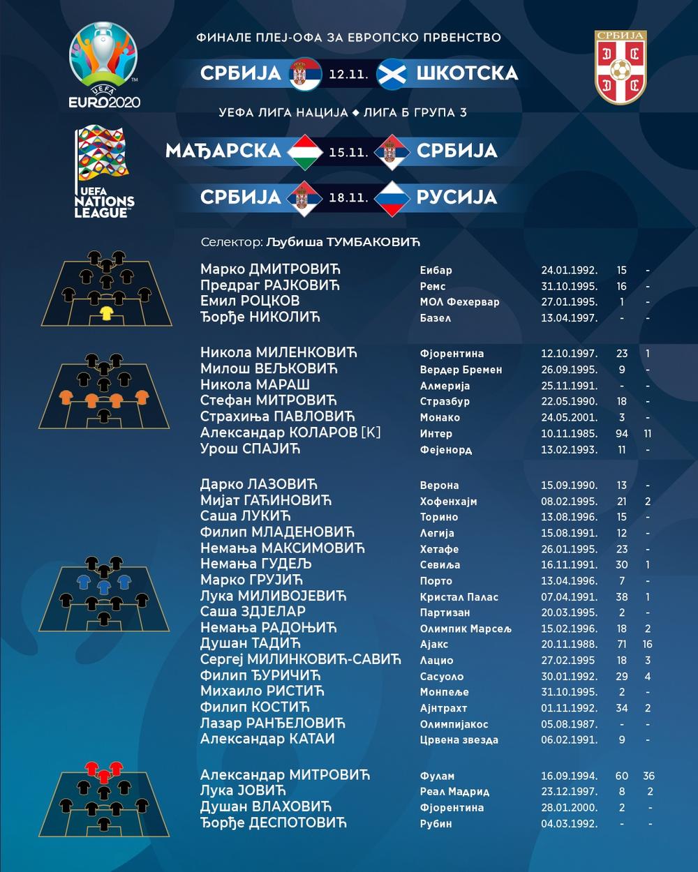 Selektor Srbije Ljubiša Tumbaković saopštio je spisak igrača na koje računa za najvažniju utakmicu reprezentacije Srbije ove godine - finale baraža za Evropsko prvenstvo protiv Škotske.