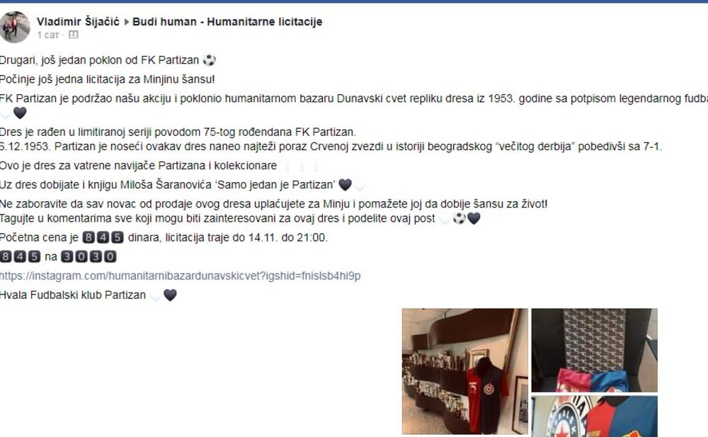 Crno-beli su poklonili dres sa potpisom legendarnog fudbalera Partizana Marka Valoka, koji je igrao za Partizan od 1947. godine, a ova fudbalska relikvija je na licitaciji koja traje do 14.11. do 21:00.