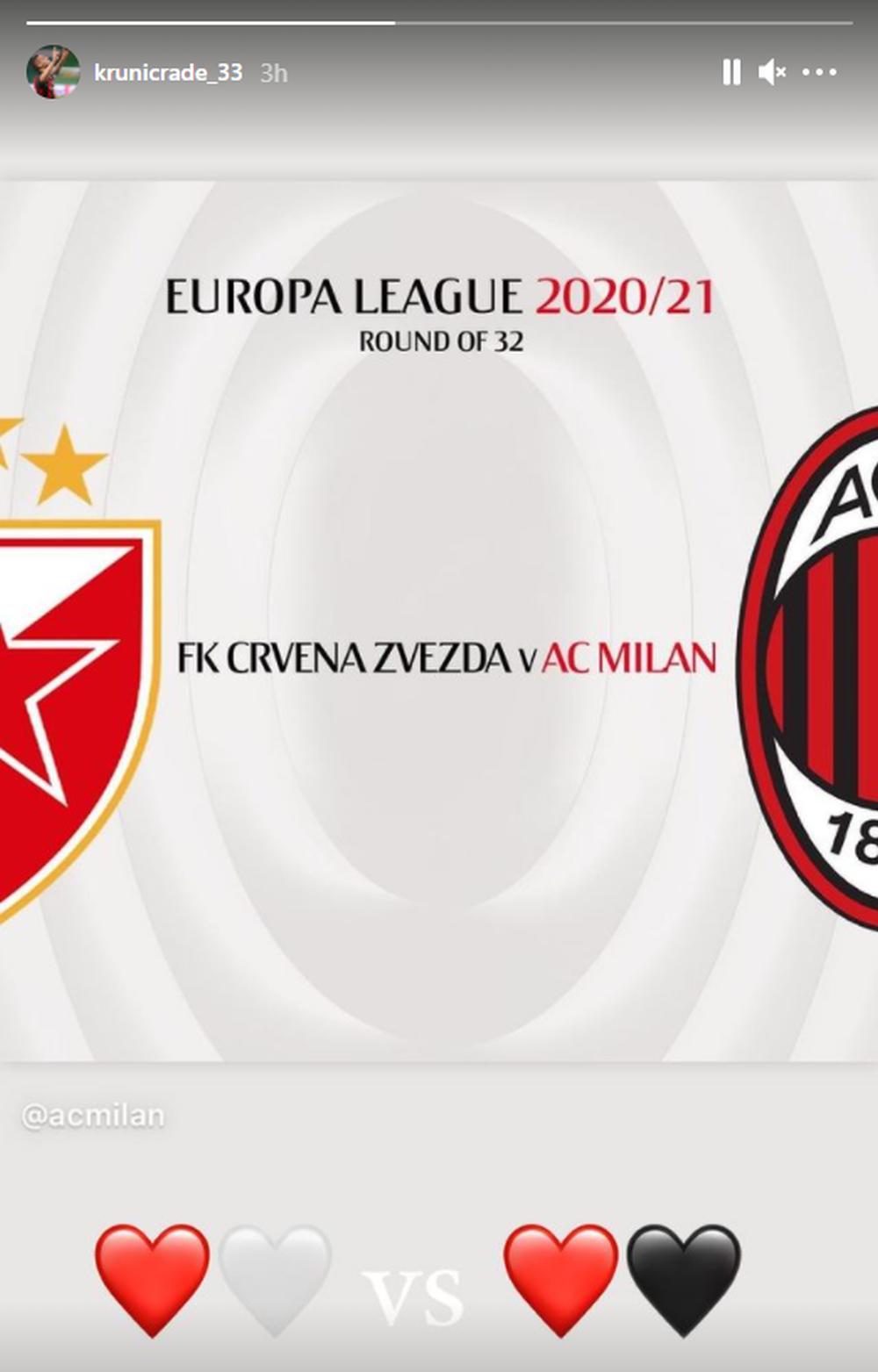 U reakciji na današnji žreb u Nionu koji je ukrstio srpskog i italijanskog velikana, Krunić je objavio stori sa grbovima dva kluba, a ispod Zvezdinog je stavio crveno i belo srce a ispod Milanovog crveno i crno.