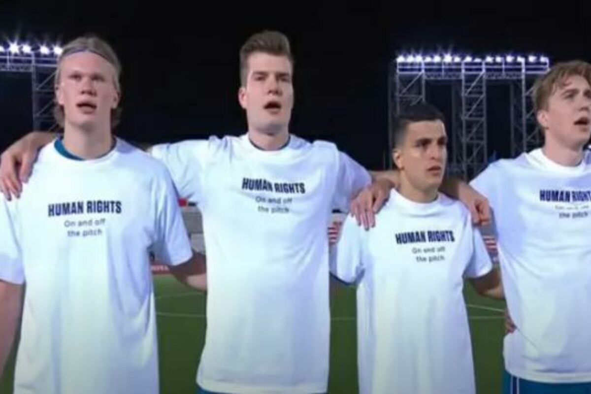 Tokom intoniranja himne reprezentativci Norveške nosili su majice sa natpisom: "Ljudska prava, na terenu i van njega".