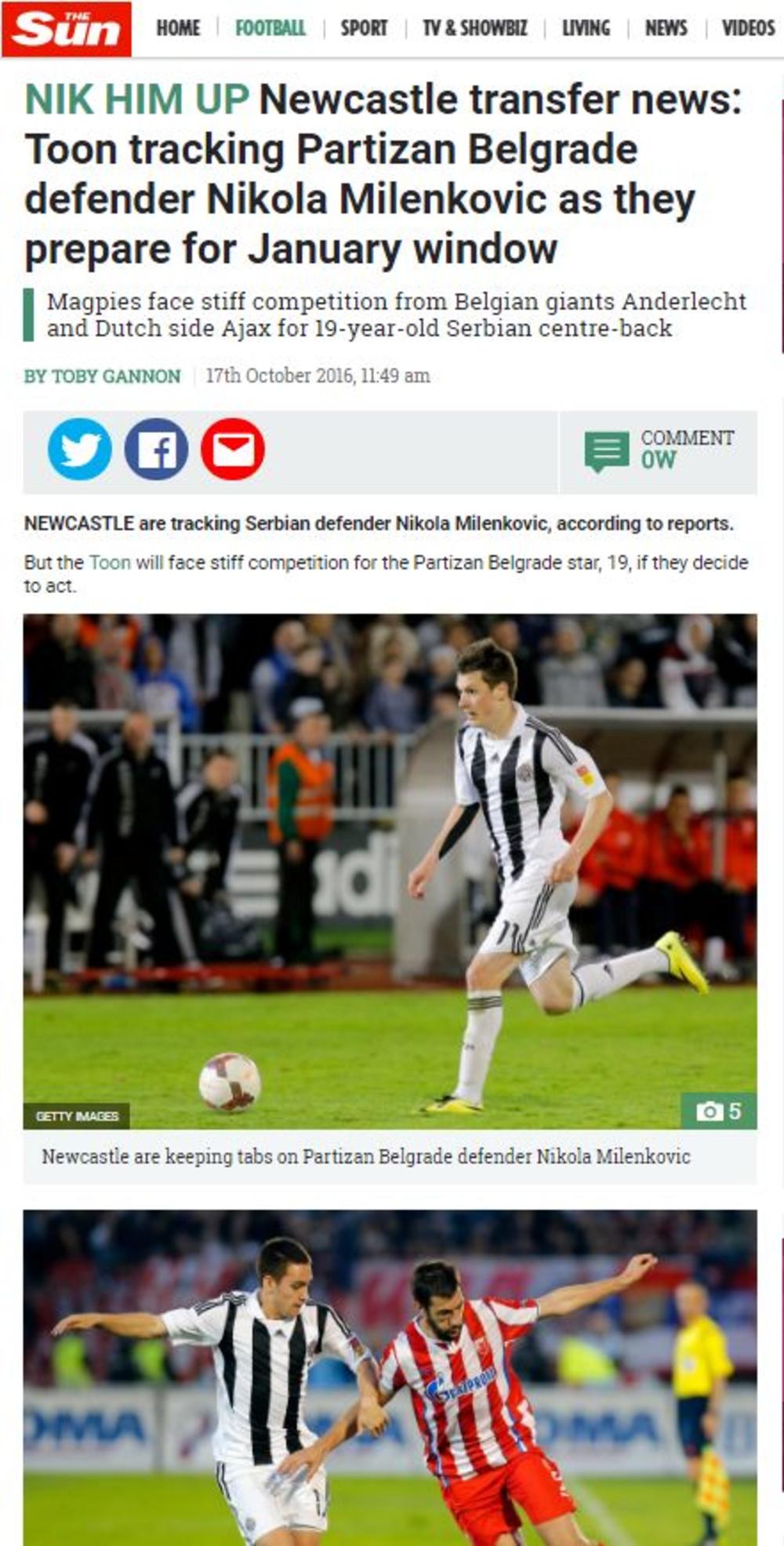 Nikola Milenković velika je želja Njukasla, a pogledajte kako je britanski Sun preneo tu vest