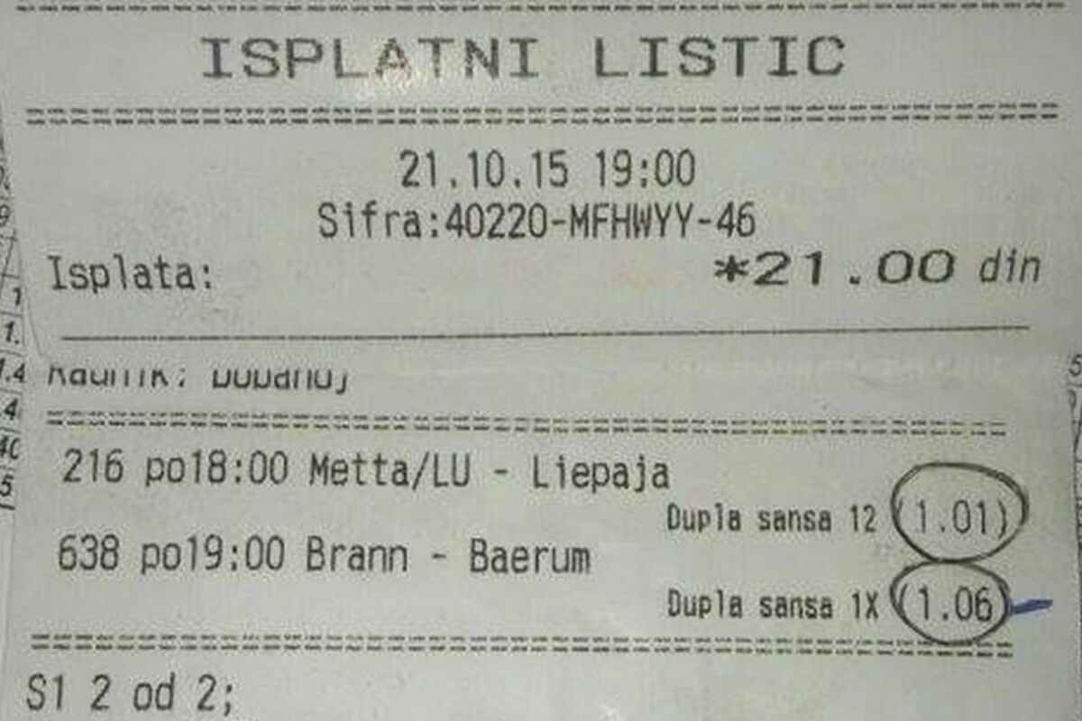 Nekada je za sreću potrebno tako malo. Jedan ljubitelj fudbala, koji je odlučio da se oproba u kladionici, ostvario je rekordno mali dobitak. Naime, on je uplatio dve utakmice za 20 dinara, a ukupan dobitak mu je bio 21 dinar. Naravno, tiket je "prošao" bez problema.