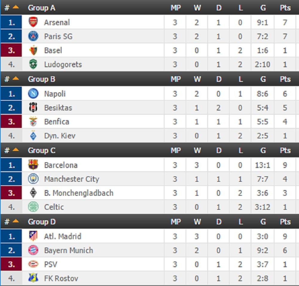 Arsenal je slavio nad Ludogorecom sa 6:0, Barselona nad Sitijem sa 4:0, dok je Bajern bio bolji od PSV sa 4:1.