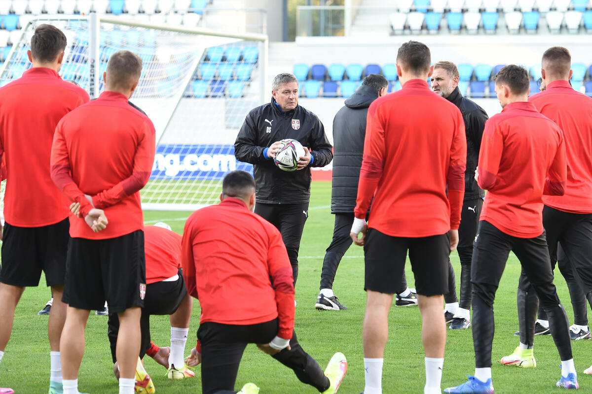 Selektor Dragan Stojković Piksi je sa saradnicima vodio trening, a prethodno je dao izjavu sa svojim očekivanjima od sutrašnjeg meča, ali i onih koji očekuje "Orlove" do kraja kvalifikacija, sa Azerbejdžanom u Beogradu 12. oktobra, pa sa Portugalom u Lisabonu u novembru.