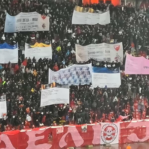 Među ostalim tu je i ona sa duela Zvezda - Bajern, ali i sa utakmica sa Liverpuilom, Arsenalom, Milanom... Ispod svega je transparent: "I sve je kao pre".