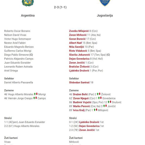 Dok su na drugoj strani mređu Jugoslavije pogađali: Juan Eduardo Esnaider iz penala i Hugo Alberto Morales.