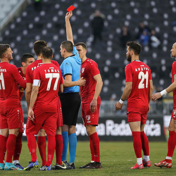 Sudija Radaković mu je najpre pokazao žuti karton, da bi posle intervencije iz VAR sobe poništio prvobitnu odluku i pokazao direktan crveni karton napadaču gostiju.