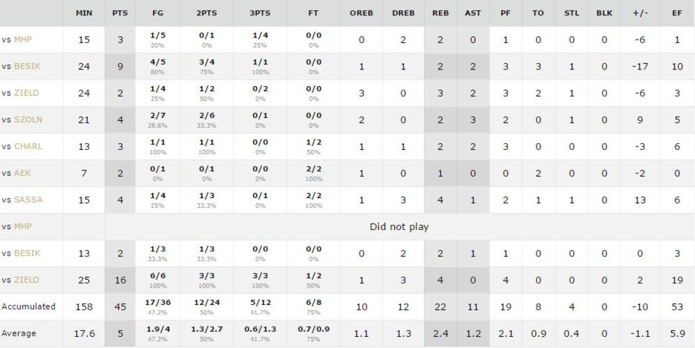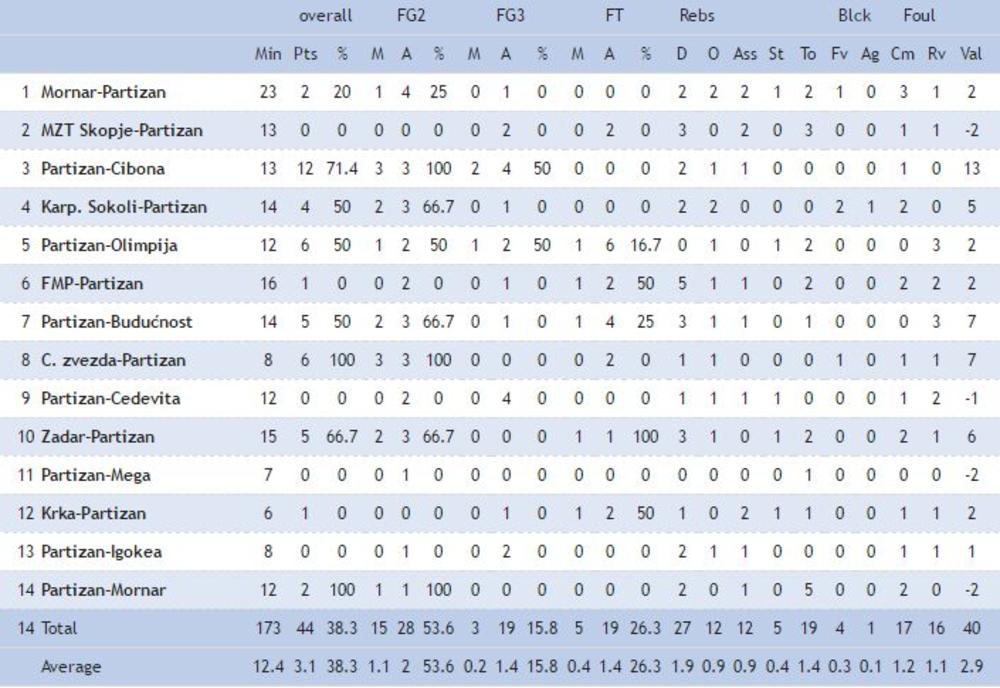 U FIBA Ligi šampiona ima 9/21 za dva, 2/9 za tri i 5/6 sa linije penala, ne uzimajući u obzir statistiku sa meča protiv Zelene Gore.