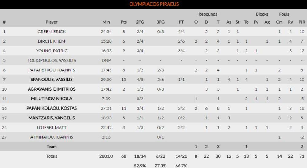 Kod grčkog tima Vasilis Spanulis je ubacio 15 poena, a Nikola Milutinov se upisao u listu strelaca i imao je indeks -5.