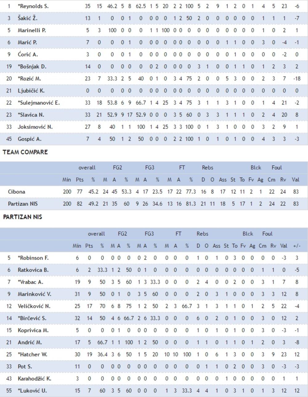 U ekipi Cibone istakao se Nik Slavica sa 21 poenom, dok je Emir Sulejmanović postigao 18. Partizan je drugi na tabeli Jadranske lige sa 13 pobeda i tri poraza, dok je Cibona četvrta sa 10 trijumfa i šest poraza.