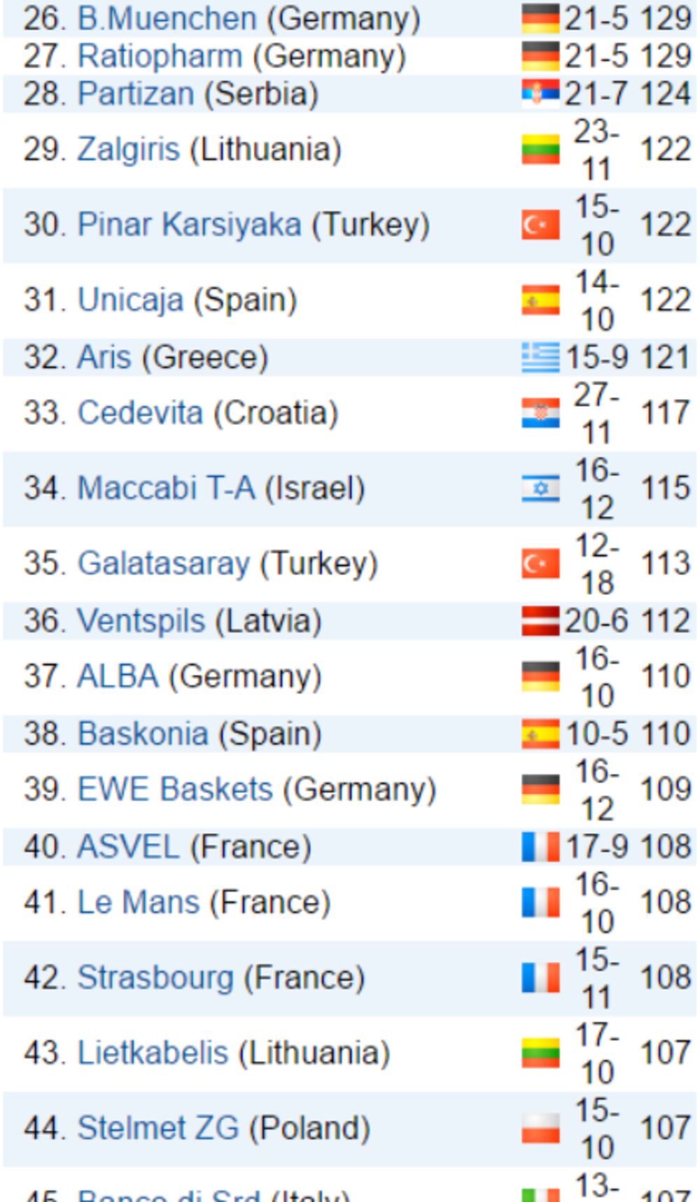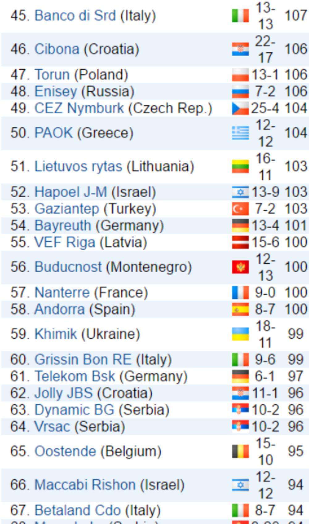 Od klubova iz regije Partizan zauzima 28. mesto, Cedevita je na 33 njihov zagrebački rival Cibona je takođe u prvih sto, crnogorska Budućnost je 56, a Džoli, Dinamik i Vršac su redom 62., 63 i 64.