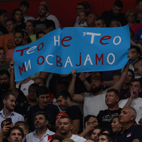 Intoniraju se himne, "Arena" je puna. Pešićevim "Orlovima" iz prvih redova podršku pružaju teniser Novak Đoković i trener Partizana Željko Obradović, jedan kraj drugog.