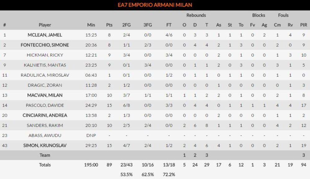 Ponovo su odlične partije pružili Davide Paskolo i Krunoslav Simon sa 15 poena, dok se Milan Mačvan zaustavio na 10. Miroslav Raduljica ubacio je samo jedan poen.