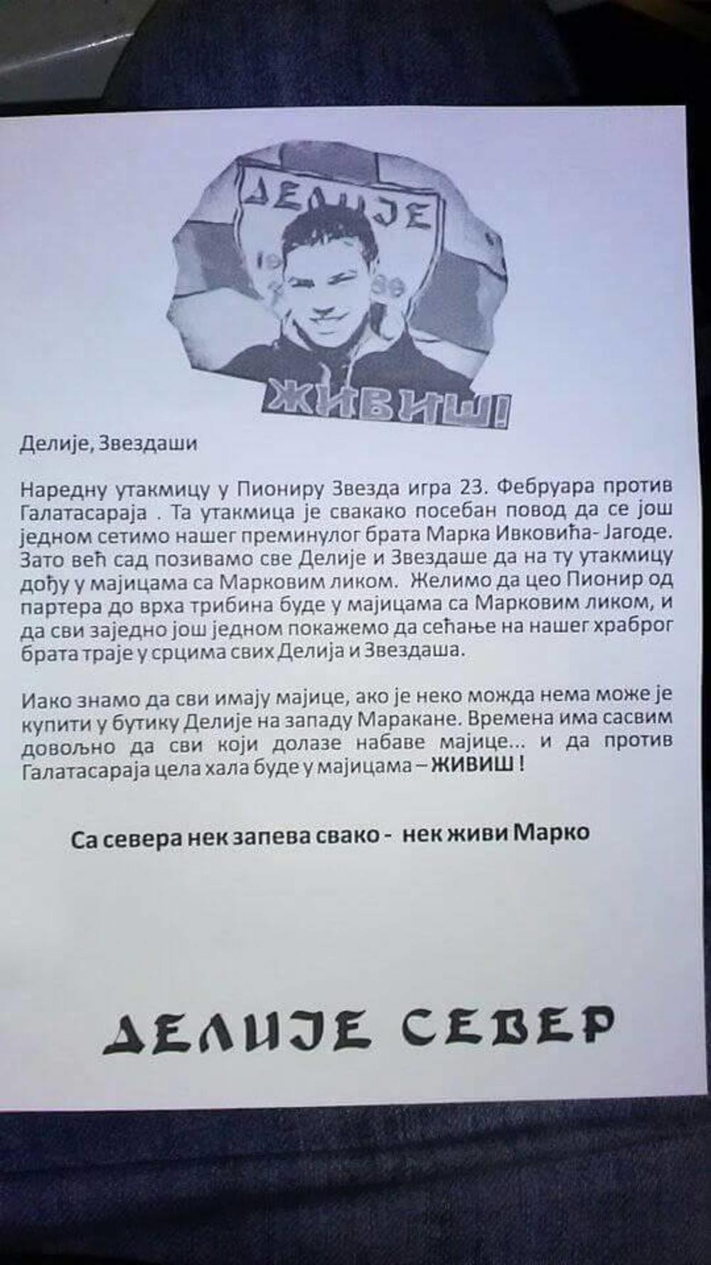 Zato su Delije već krenule u akciju i mobilizaciju, pa se tako društvenim mrežama širi obaveštenje da osim punjenja dvorane, svi dođu u majicama sa likom ubijenog Marka Ivkovića Jagode, koji je nastradao od strane navijača turskog tima prilikom gostovanja u Istanbulu.