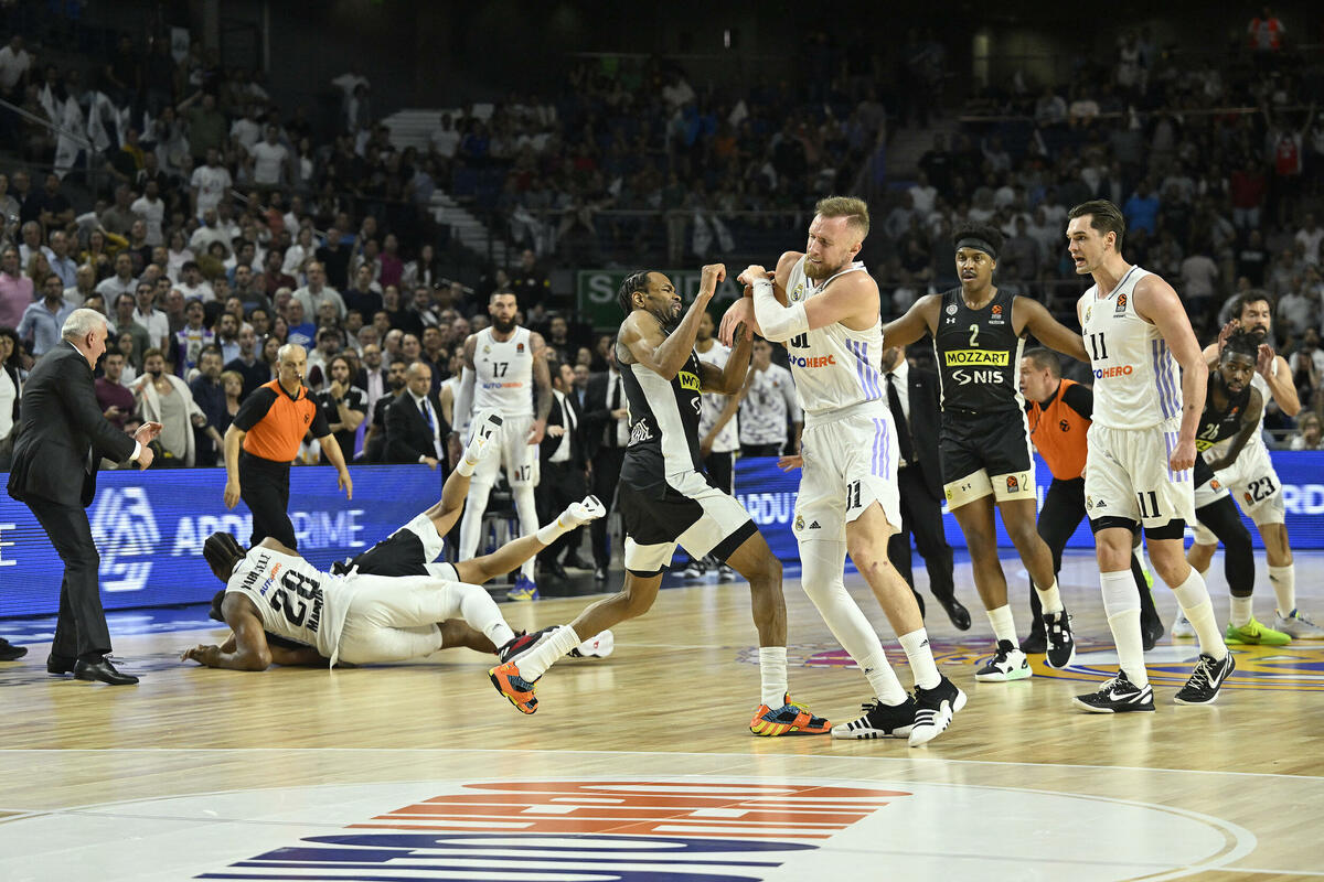 - Druga utakmica plej-of serije između Real Madrida i Partizana Mozzart Bet Beograd prekinuta je na 1 minut i 40 sekundi do kraja, u četvrtak, kada je došlo do svađe na terenu i većina obe klupe se ispraznila. Kada su ekipe izbačene, odnosno, kada je kazna primenjena za one igrače koji su učestvovali u tuči i one koji su automatski izbačeni zbog napuštanja prostora za klupu, nijedna ekipa nije imala potreban minimum od dva igrača koji je potreban da se završi utakmicu, tako da se utakmica smatra zvanično završenom rezultatom u to vreme prekinuto je 80-95 u korist Partizana, koji tako sada vodi u seriji 2-0.
