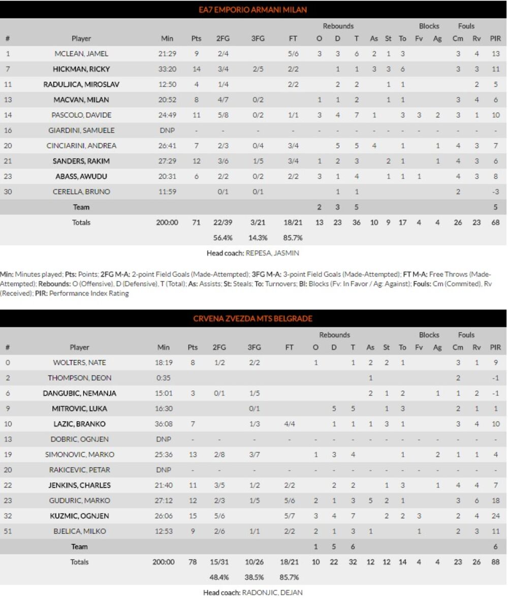 Zvezda je ovako zabeležila 15. trijumf, i ostala je ispred Efesa, koji je ranije danas pobedio Makabi 92:87, ali i Baskonije, koja sutra igra protiv CSKA. Crveno-beli su u Milanu igrali bez Stefana Jovića, dok je domaći tim nastupio bez Zorana Dragića, Krunoslava Simona i Mantasa Kalnietisa. Italijanskoj ekipi ovaj meč nije imao nikakvog rezultatskog značaja.