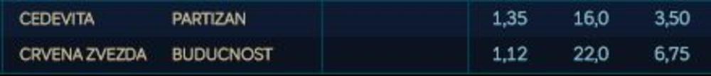Što se tiče prvih utakmica i tu se dobro plaća igranje na Partizan, pošto je kvota na pobedu izabranika Aleksandra Džikića u hrvatskoj prestonici je 3.50, a na crveno-bele protiv Budućnosti svega 1.12.