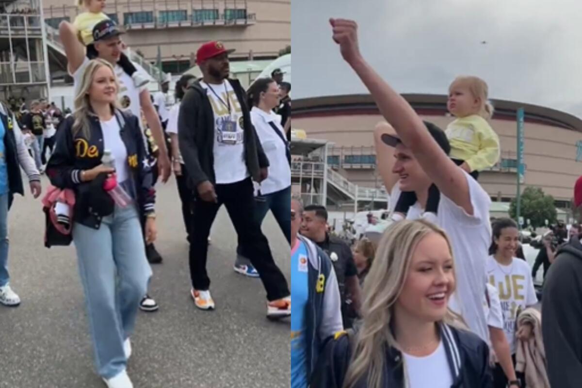 Jokić na glavi nosi šampionski kačekta a na ramenima nosi ćerkicu Ognjenu, dok je sa njima, naravno, Nikolina supruga Natalija.