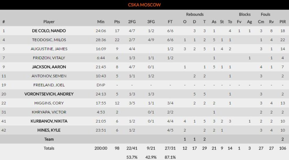 Teodosić je predvodio CSKA sa 22 poena (2/7 dva, 4/9 tri) uz pet asistencija, te pomenutom trojkom koja je verovatno rešila susret.