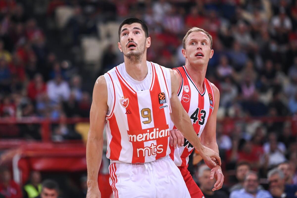 Luka Mitrović i Luk Sikma u duelu na meču Olimpijakosa i Crvene zvezde, Foto: Stefanos Kyriazis / Zuma Press / Profimedia