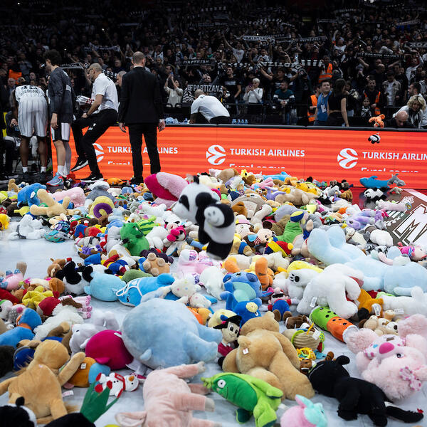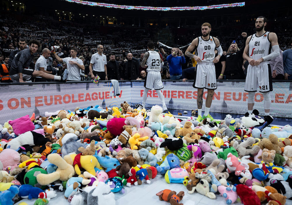 "Grobari" su sa tribina Beogradske arene zasuli teren plišanim igračkama.