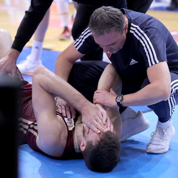 Na šest minuta i 15 sekundi do kraja prve četvrtine, jezivo se povredio Ognjen Kuzmić, centar "pantera, a ujedno i nekadašnji košarkaš crveno-belih.