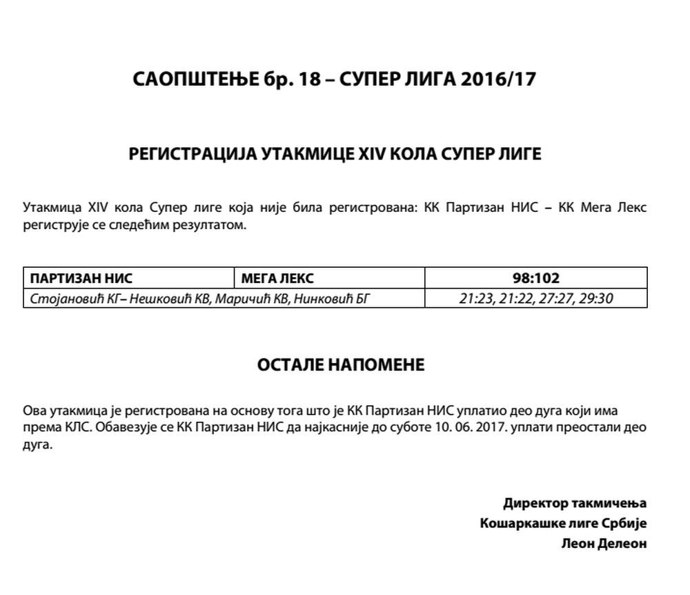 U međuvremenu, vicešampion Srbije je uplatio je uplatio deo duga, pa je meč mogao da bude registrovan, a u saopštenju direktora lige se navodi da preostali dug crno-beli moraju da uplate do 10. juna 2017. godine.