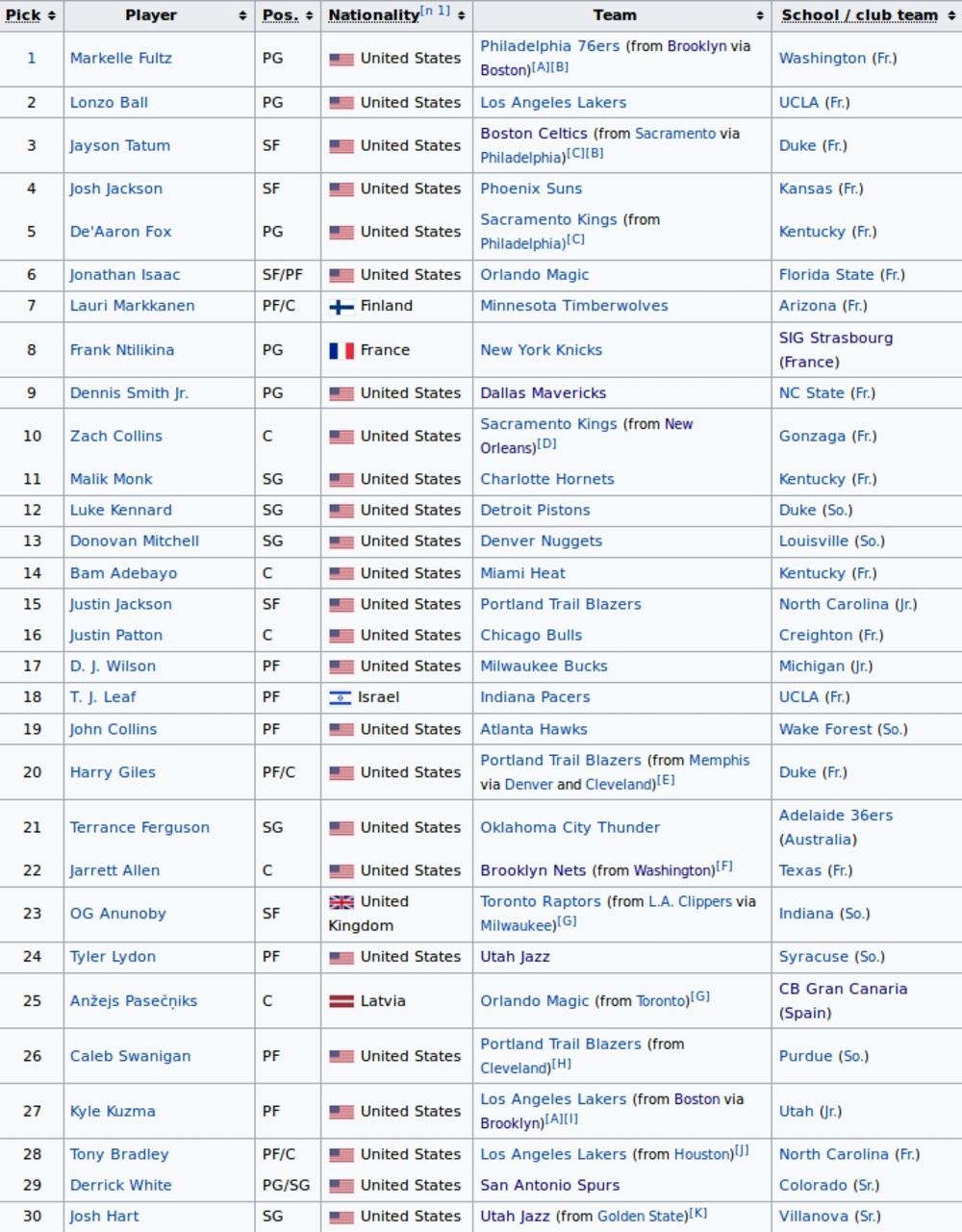 Finski centar Lauri Markanen sa Arizone najbolje je plasirani evropski košarkaš na draftu. Njega su kao sedmog pika izabrali Minesota Timbervulvsi malo pre nego što su Niksi pravo izbora sa osme pozicije potrošili na francuskog plejmejkera Franka Ntilikinu iz Strazbura. Od Evropljana birani su još britanski košarkaš Ogugua Anunobi, izbor Toronto Reptorsa sa 23. pozicije, letonski centar Anžejs Pasečniks, kojeg je kao 25. pika izabrao Orlando Medžik i Isaja Hartenštajn, Nemac iz Žalgirisa, kojeg su sa 43. pozicije birali Hjuston Roketsi.