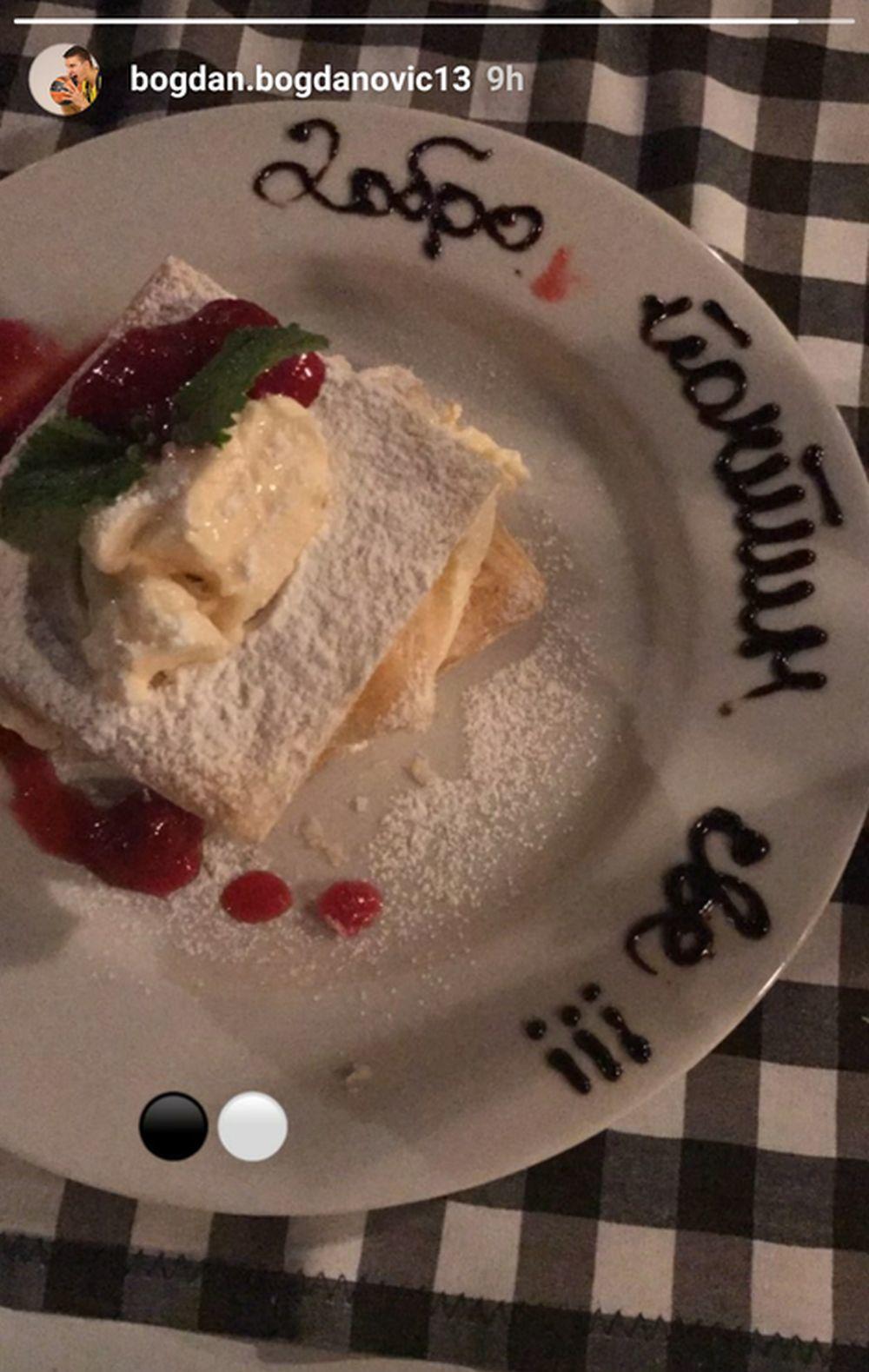 Srpski as je poručio poslasticu, a na tanjiru je dobio ispisano "Dobro pamtim sve" što je pesma koju pevaju Grobari. Bogdanović se time pohvalio i na svom Instagramu.