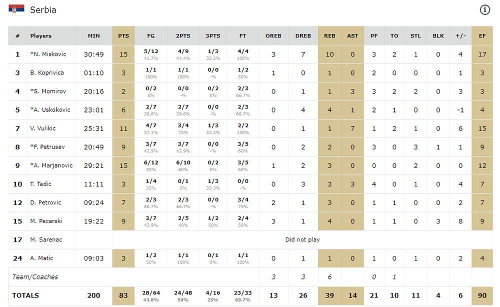 Najefikasniji u našem timu bili su Mišković i Marjanović sa po 15 poena, a 11 je dao Vulikić. Kod protivnika Kisunas 18, Venskus 17 i Velicka 16.