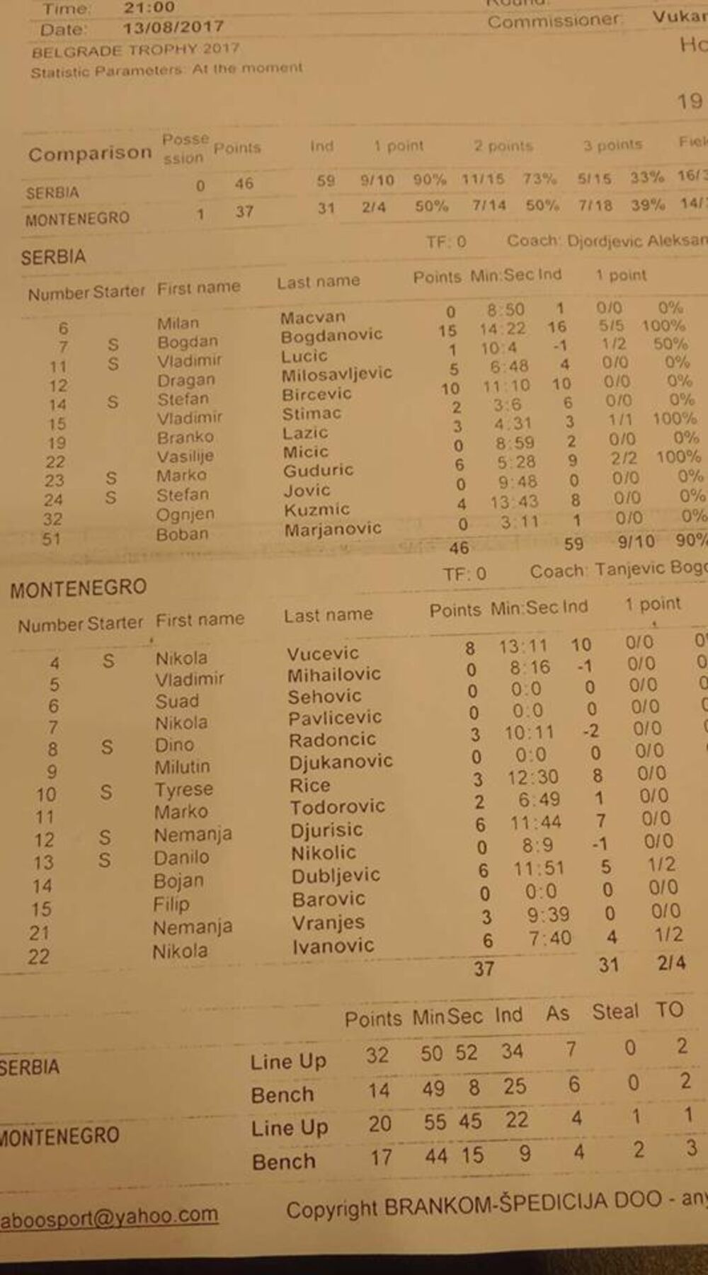 46:37 - KRAJ POLUVREMENA! Srbija je uspela da dođe do prednosti sredinom druge deonice posle odlične serije reprezentacije Crne Gore, koja je vodila čak i sa 29:23. Onda su naši sjajno preokrenuli i serijom od 18:6 poveli sa 41:35. Ovaj deo igre ostaće upamćen po nekolicini majstorija Bogdana Bogdanovića. Crnogorci su, inače, gađali trojke čak 6/10, ali je i naš šut proradio u drugoj deonici.