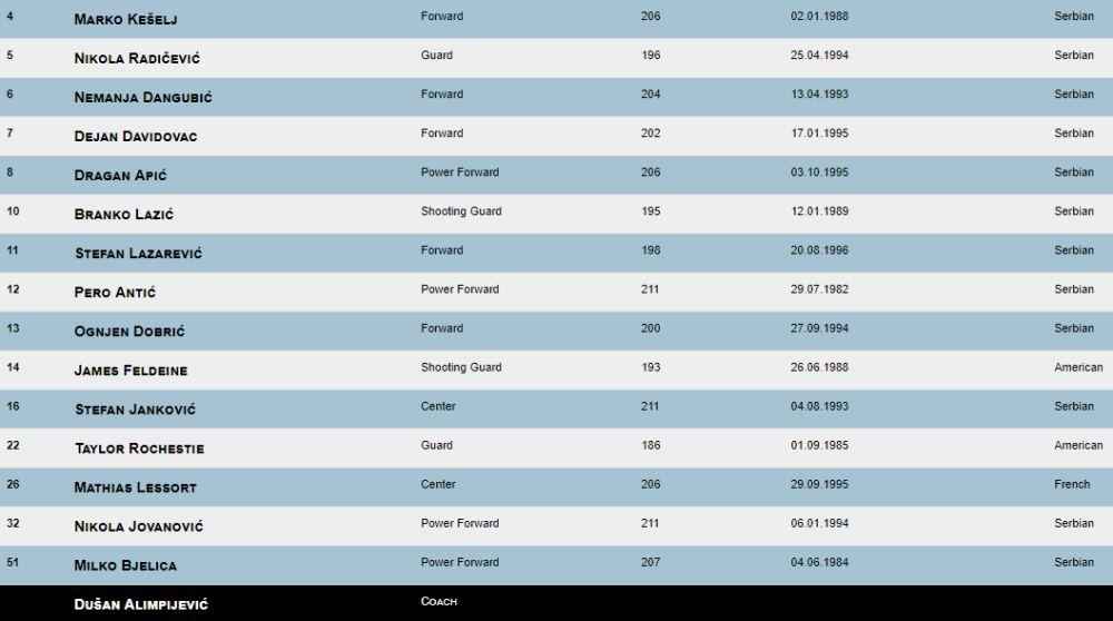 Došli: Marko Kešelj (Ostende), Nikola Jovanović (Vestčester), Stefan Janković (Eri Bejkoks), Nikola Radičević (Sevilja), Džejms Feldin (Panatinaikos), Matijas Lesor (Nanter), Tejlor Ročesti (Lokomotiva Kubanj), Pero Antić (Fenerbahče), Stefan Lazarević (FMP), Dragan Apić (FMP), Dejan Davidovac (FMP).