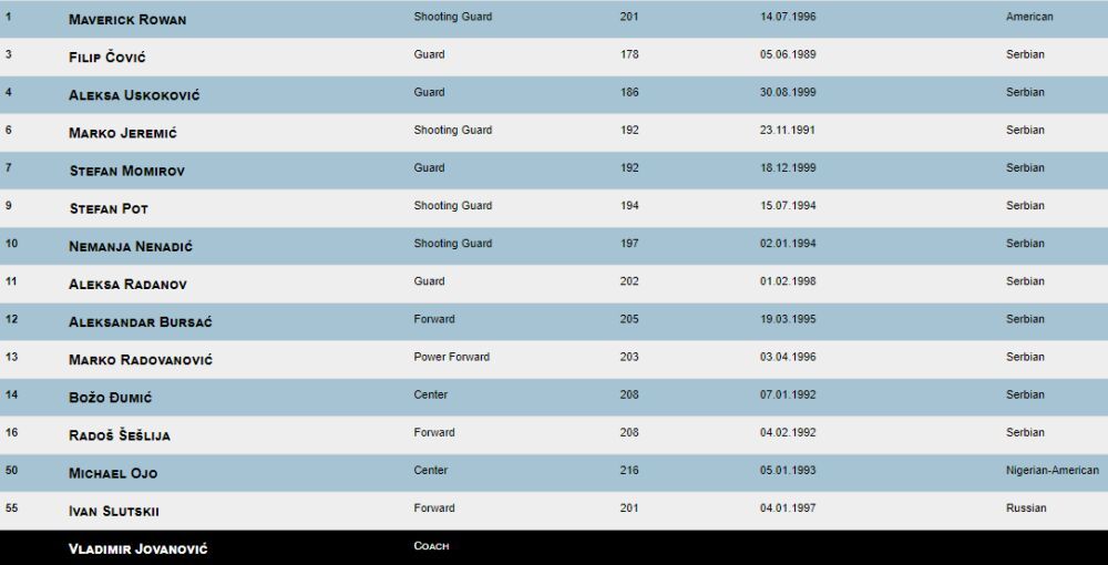 Došli: Strahinja Mićović (Igokea), Nemanja Vranješ (Budućnost), Brendis Ros (Bero), Uroš Luković (Partizan), Derek Nidam (Ređo Emilija), Karvijar Šeferd (TCU).