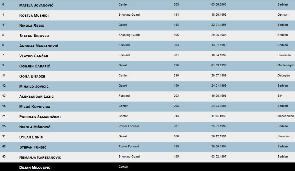 Došli: Stefan Fundić (Vršac), Dilan Ennis (Oregon), Aleksandar Lazić (Dinamik), Miloš Koprivica (Partizan), Andrija Marjanović (Barselona Lasa), Stefan Sinovec (MZT).