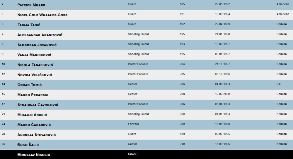 Došli: Obrad Tomić (Kakanj), Aleksandar Aranitović (Crvena zvezda), Tomas Vilson (Bojs), Najdžel Vilijams Gos (Gonzaga), Andreja Stevanović, Strahinja Gavrilović, Marko Čakarević (Dinamik), Patrik Miler (Santo Domingo), Đoko Šalić (Sutjeska), Marko Pecarski (Bajern Minhen), Dimitrije Nikolić (KKK Radnički)