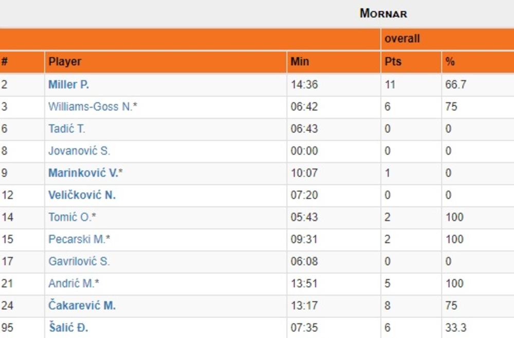 10' - Košarkaši Mornara dali su čak 36 poena u prvoj četvrtini, i vode protiv Partizana posle 10 minuta 36:20! Najefikasniji igrač na meču je Mićović sa 10 postignutih poena, a kod crno-belih Vilijams-Gos je najefikasniji sa 6 koševa. Mornar je postigao čak 6 trojki iz 7 pokušaja.