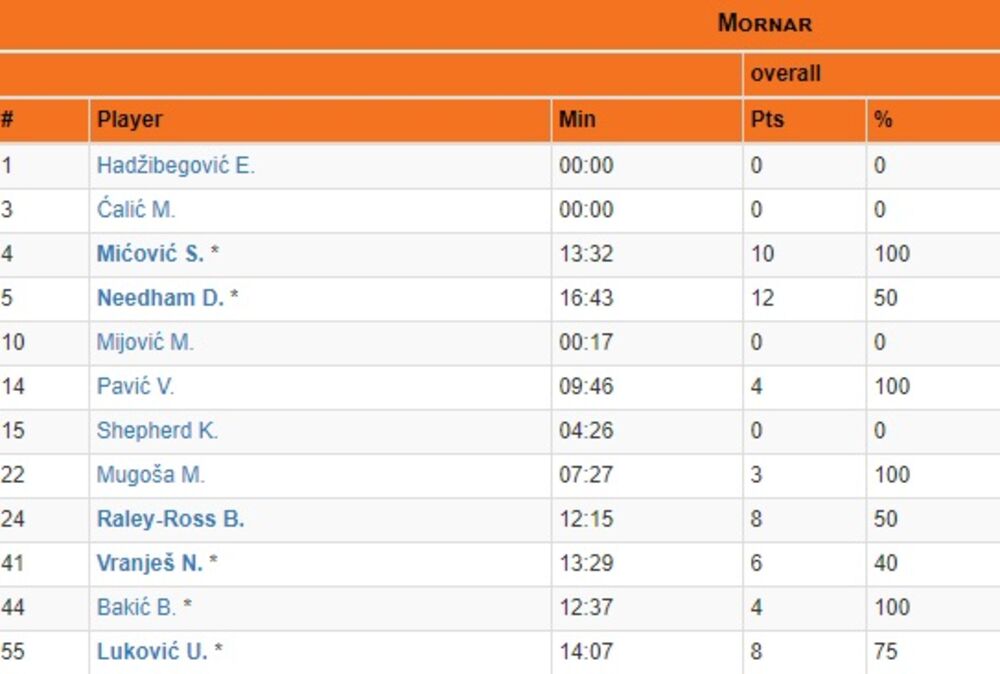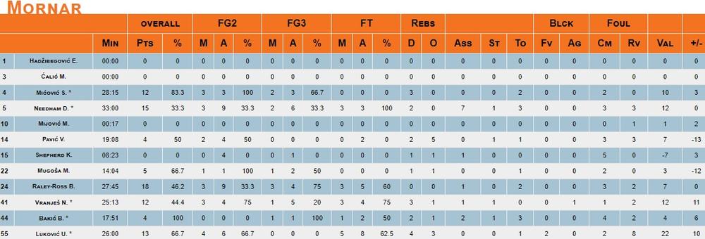 20' - Mornar vodi posle 20 minuta rezultatom 54:41! Partizan se malo digao posle očajne prve čevrtine i smanjio prednost na podnošljivih 13 razlike. Nidham je postigao 12 poena u domaćoj ekipi, a kod gostiju najefikasniji je Miler sa 11.