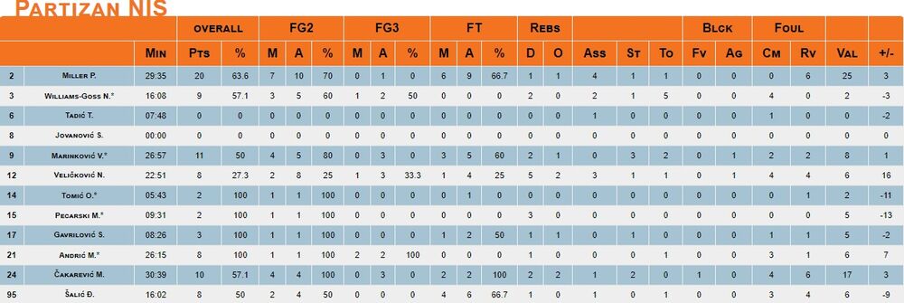 Partizan je na putu ka preokretu koji se na kraju nije dogodio vodio novajlija Patrik Miler sa 20 poena, a samo su još Vanja Marinković (11 pts) i Marko Čakarević (10 pts) bili dvocifreni u poraženom sastavu.