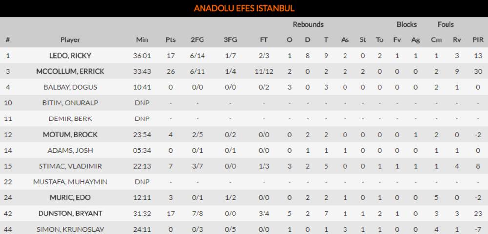 Ognjen Kuzmić je za skoro sedam minuta upisao samo dva poena, dok je Vladimir Štimac novo pojačanje Efesa postigao sedam poena na meču.