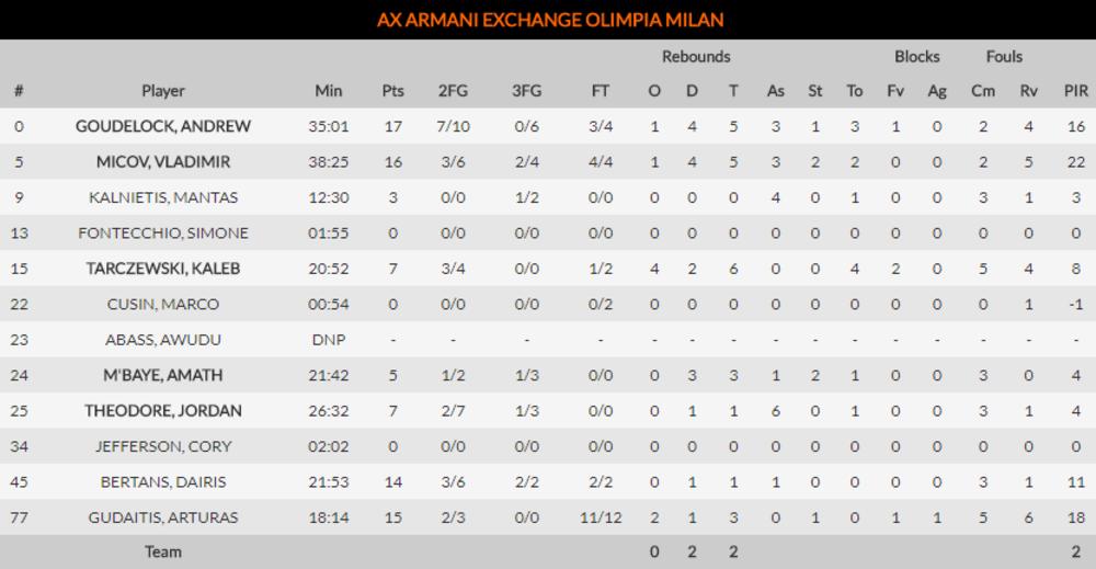 U gostujućem taboru najviše se istakao Gaudlok sa 17, dok je srpski košarkaš Vladimir Micov postigao poen manje.