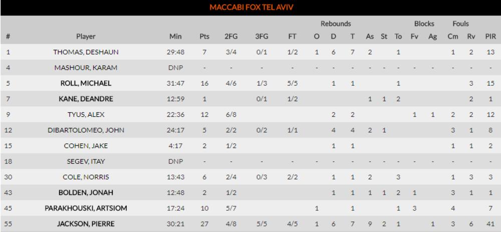 Kod Makabija odličan je bio Majkl Rol sa 16 poena, Aleks Tajus je ubacio 12, a Artsjom Parahovski 10 poena. Džona Bolden je imao dva poena i po jedan skok, asistenciju i ukradenu loptu za 13 minuta na terenu. U domaćem sastavu Nikos Zizis je imao 16 poena, pet asistencija i četiri skoka, Leon Radošević je dopisao 12 poena i šest uhvaćenih lopti, dok je Luka Mitrović skupio devet poena, tri skoka i dva završna dodavanja.