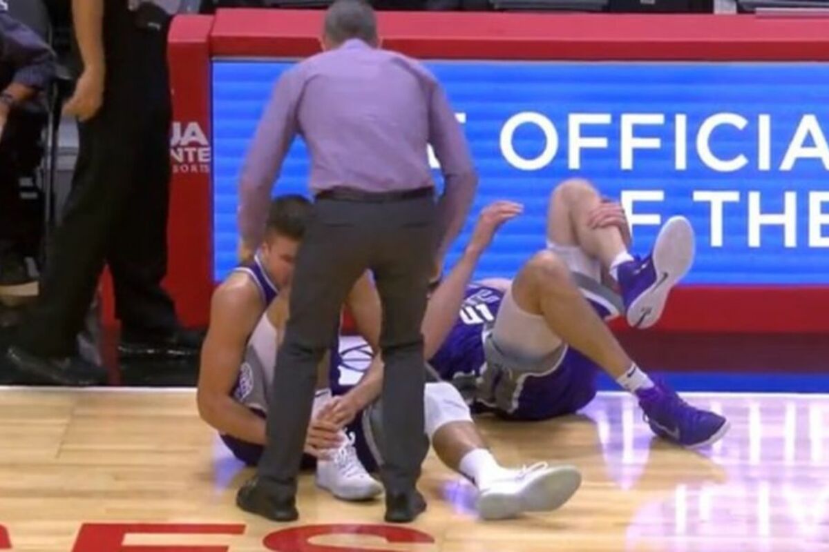 Međutim, u sudaru je nezgodno doskočio na stopalo svog saigrača i odmah se uhvatio za desni zglob noge što možete videti na 2:38 na snimku ispod.