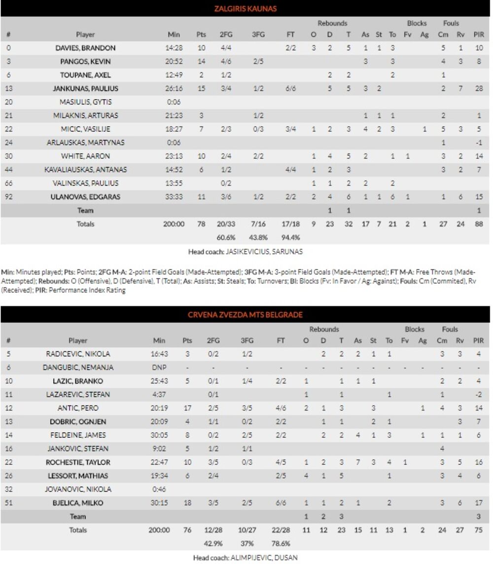 Vrlo dobar i Stefan Marković sa devet poena i po dve asistencije i ukradene lopte, dok je Čarls Dženkins meč završio bez poena, morao je i ranije na klupu zbog pet upisanih faulova.