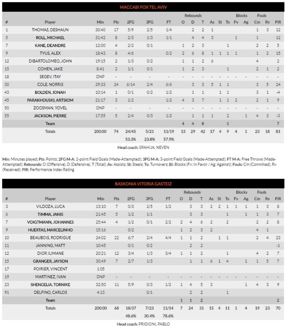 Izraelskom timu je to druga pobeda, dok je Baskonija upisala drugi poraz. Makabi je do pobede vodio Noris Kol sa 24 poena, dok je Dešon Tomas postigao 17.